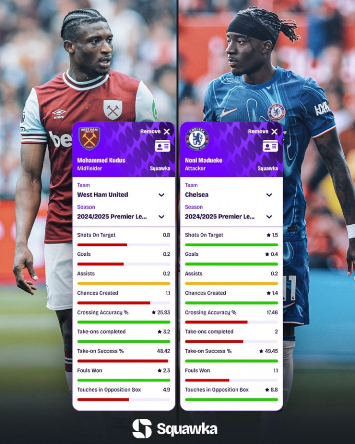 直播吧7月11日讯热刺官方宣布签下西汉姆边锋库杜斯,Squawka统计了库杜斯与马杜埃凯(据悉将转会阿森纳)上赛季英超每90分钟数据,并做出对比。